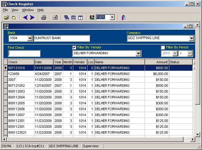 The check register is an on-line view of all the checks that have been issued for a specific bank account and within a specific company. To be able to display this information, select the company and the bank account from he drop-down list. Once this criteria has been selected, a listing will appear with the check number, date, vendor information, amount and current status (voided or blank).
